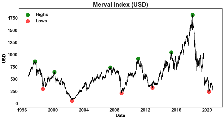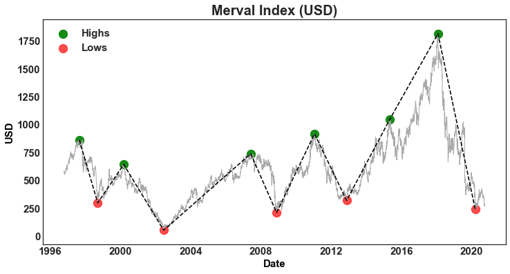 These cycles of illusion and disenchantment are also visible when analysing the MERVAL index in nominal dollars, without adjusting for inflation.