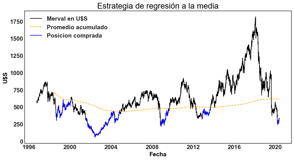 Para simplificar, y dado que en Argentina no es posible shortear acciones de manera directa, supongamos una estrategia en que se compra el Merval siempre que vale U$S 330, es decir, valores actuales. La posición comprada se vende una vez que se llegue a la media del índice.