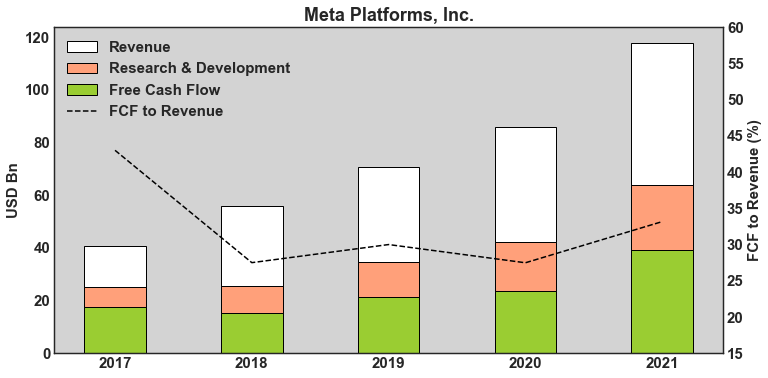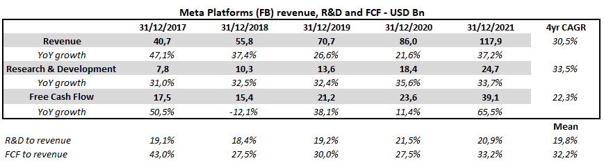 As usual, the stock movement didn’t have much to do with the past of the company. in 2021 Meta achieved 37,2% revenue growth and USD 39,1 Bn in free cash flow (+65,5% YoY). That’s on top of USD 24,65 Bn spent on research & development (+33,6% YoY).